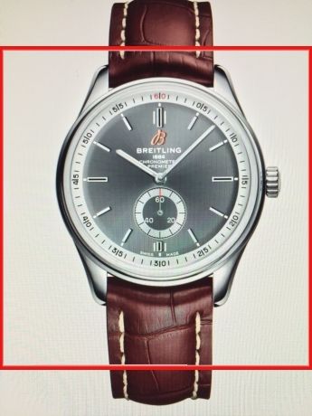 The face has Color grey, Color white, Hands 18 kt. gold and the lunette is Stainless steel, Polished. The movement is 31 jewels, 38 hour power reserve, Half-oscillations A/h 28800, Mechanical movement self winding, Breitling 37.