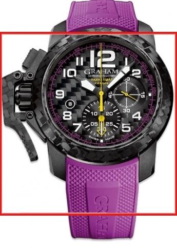 The face of the dial has Color black, Carbon and the bezel is Karbon. This men’s watch comes with a 25 jewels, Power reserve 48 hour, Half-oscillations A/h 28800, Incabloc anti-shock protection, Mechanical movement self winding, Graham caliber G1747, automatic chronograph movement. The Rubber, violett bracelet completes the picture of this men’s watch. The functions of this luxury men’s watch include Chronograph, Date, Hour minute. Find more mens watches on the men’s watch category page.