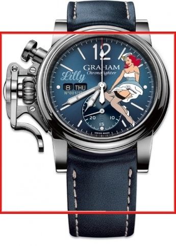The face of the dial has Color blue, Nose Art LTD Lilly and the bezel is Stainless steel with special hard coating. This men’s watch comes with a 25 jewels, Power reserve 48 hour, Half-oscillations A/h 28800, Incabloc anti-shock protection, Mechanical movement self winding, Graham caliber G1747, automatic chronograph movement. The Cow leather strap, Textile strap bracelet completes the picture of this men’s watch. The functions of this luxury men’s watch include Chronograph, Date, Hour minute. Find more mens watches on the men’s watch category page.
