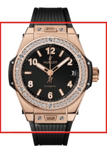 The face has arabic numerals, Color black, Markers and skeletised hands with superluminova and the lunette is 18 kt red gold, Diamonds. The movement is Power reserve 50 hour, Half-oscillations A/h 28800, Mechanical movement self winding, HUB1710.