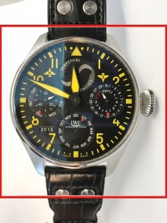 The IWC Fliegeruhren 502640 pilot watch has a beautiful arabic numerals, Color yellow, Color black dial and Breguet spring, Power reserve 7 Days, Glucydur balance wheel, Half-oscillations A/h 21600, IWC pellaton caliber, Mechanical movement self winding, Caliber 51614, jewels 62, powerreserve 168 hour movement, which are wrapped in a solid case. The watch comes with functions like 12 hour totalizer, 30 minute totalizer, Day/date, Perpetual calender, Power reserve, Calendar, Month, Moonphase, Second stop, Hour minute, Week day. It is difficult to confuse the attention to detail and craftsmanship of this watch. Find other Pilot Watches in the pilot watch category.