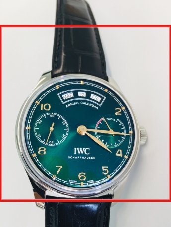 The face has arabic numerals, Color green, Index, Hands 18 kt. gold and the lunette is Stainless steel, Polished. The movement is 36 jewels, Power reserve display, Half-oscillations A/h 28800, Mechanical movement self winding, IWC caliber 52850.