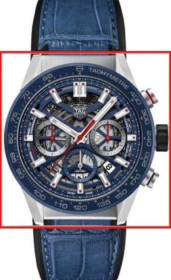 The face has Color blue, Red hand, Skeletonized and the lunette is Ceramik, Engraved tachymeter scale. The movement is Glucydur balance wheel, Half-oscillations A/h 28800, Incabloc anti-shock protection, Mechanical movement self winding, TAG Heuer caliber 02, 33 jeweils, 75 hour powerreserve.