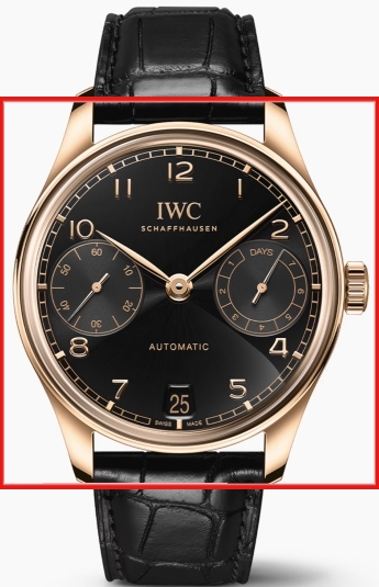 The face has arabic numerals, Color black, Index, Hands 18 kt. gold and the lunette is 18 kt red gold, Polished. The movement is 31 jewels, Breguet spring, Half-oscillations A/h 28800, Mechanical movement self winding, IWC caliber 52011.